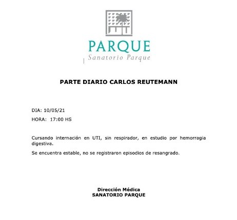 Además, el reporte remarca que en las últimas horas no se volvió a registrar un episodio de sangrado, pero que de todos modos continúan realizándole estudios por la hemorragia digestiva por la que fue trasladado al sanatorio privado.