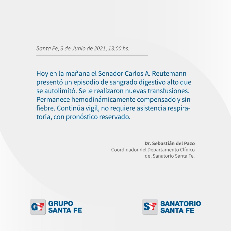 Un parte emitido por la tarde por el equipo del Departamento Clínico del Sanatorio Santa Fe indicó que el ex gobernador presentó “un episodio de sangrado digestivo alto que se autolimitó”.