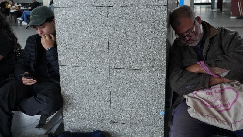 En la recorrida que hizo Rosario3 se pueden observar los pasajeros haciendo fila tanto para ascender a micros como para comprar los pasajes. La espera, para algunos, era demasiado larga y aprovecharon para hacer una siesta.