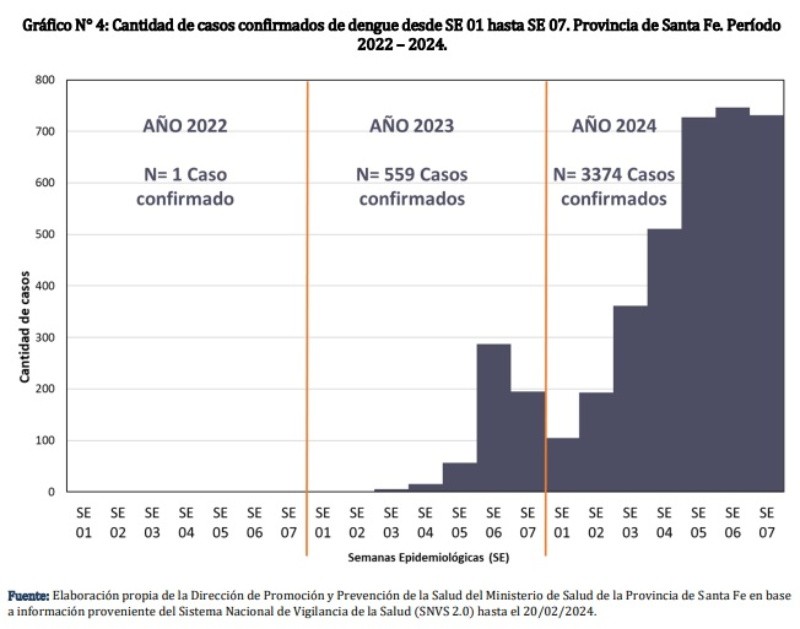 El Ministerio de Salud de Santa Fe informó que durante la semana comprendida entre el 10 y el 17 de febrero se notificaron 1.030 nuevos casos de dengue en la provincia, según el último informe epidemiológico publicado hasta el momento. De esta manera, el total de contagios registrados desde el 31 de diciembre ascendió a 3.374, mientras que en las localidades con circulación viral se comenzaron a confirmar los casos por nexo epidemiológico.