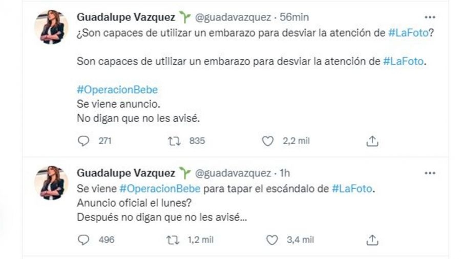 Apenas la primera dama publicó las fotos que generaron revuelo en la red, Guadalupe Vázquez, la periodista que sacó a la luz la foto del festejo de Fabiola y Alberto Fernández en Olivos, escribió en Twitter: "Se viene #OperacionBebe para tapar el escándalo de #LaFoto. ¿Anuncio oficial el lunes? Después no digan que no les avisé".