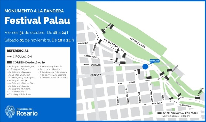 En tanto, en la zona del Monumento a la Bandera, a partir de las 16 y hasta el final del festival Palau, se procederá a cortar el paso en los siguientes puntos, al igual que el viernes.