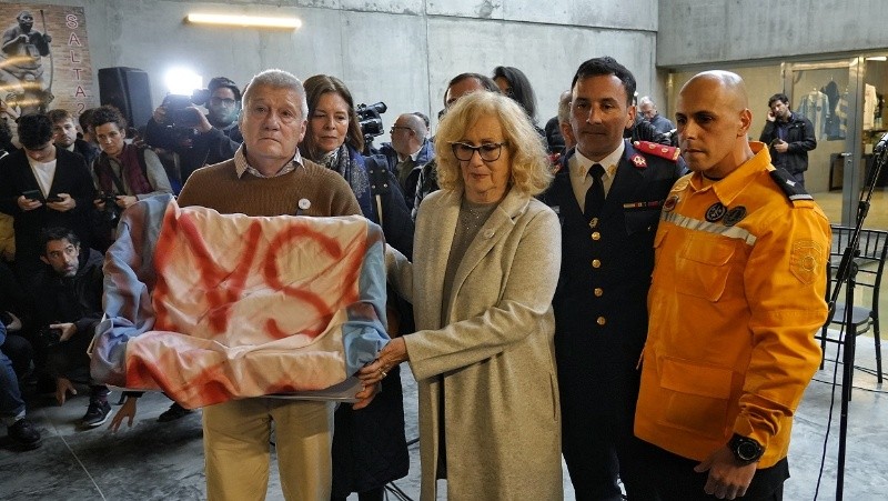 La propia Alicia fue quien luego recibió, en representación de todos los familiares de las 22 víctimas, la entrega de una caja con la bandera que reza la palabra “gracias” en aerosol rojo, la misma que colgaron los bomberos zapadores y voluntarios al terminar su búsqueda de las víctimas tras varias semanas posteriores al estallido del edificio, en el corazón de la cuadra de Salta entre Oroño y Balcarce. Esta será parte de la colección de objetos que se exhibirán en el futuro museo de la asociación civil Salta 2141. Memoria y Justicia.