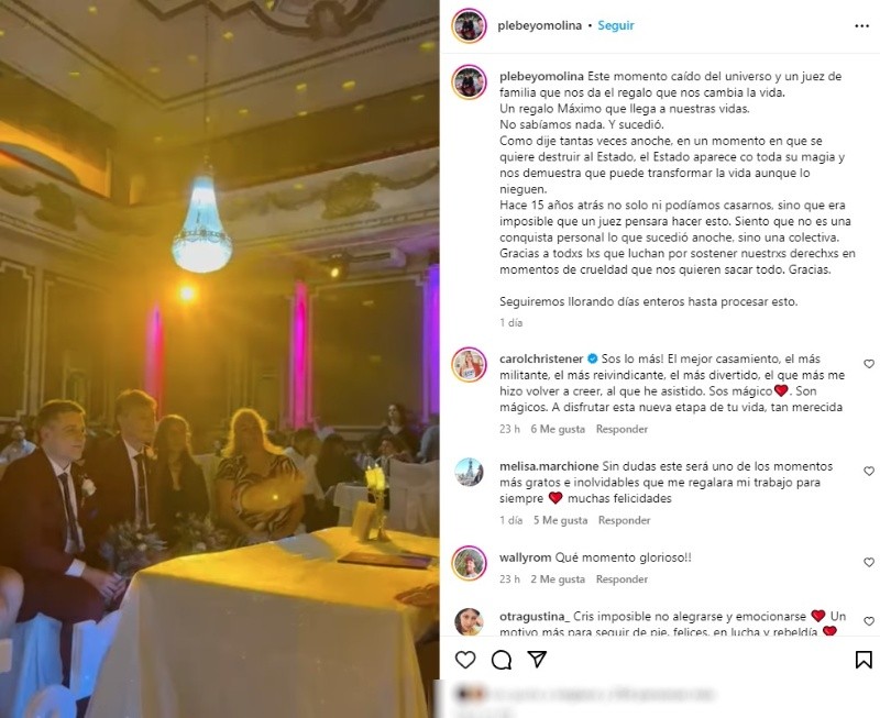 Uno de los integrantes de la pareja es el poeta Cristian Molina, quien compartió su emoción con sendas publicaciones en Instagram.
