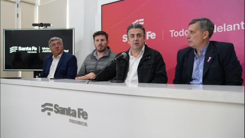 El anuncio se realizó en la sede de Gobierno en Rosario y estuvo encabezado por los ministros de Justicia y Seguridad, Pablo Cococcioni, y de Economía, Pablo Olivares, junto al subsecretario de Intervención Federal del Ministerio de Seguridad nacional, Federico Angelini, y el titular de Iapos, Nolasco Zalazar.