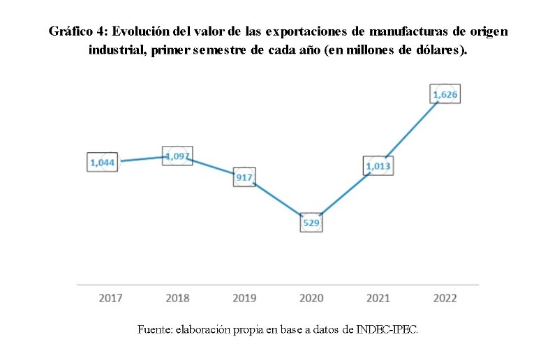 Además, en el período enero-junio de 2022 se registraron exportaciones de Manufacturas de Origen Industrial por un monto total de U$S 1.626 millones, un 60,5% por encima en relación a igual período del año anterior.