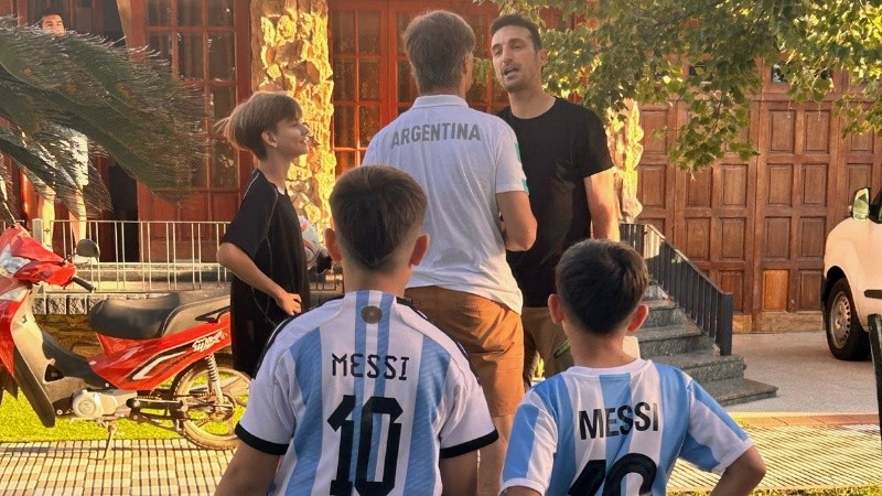 De los nueve pibes que esperan por una foto y un autógrafo, ocho tienen puesta la camiseta número 10 de Messi. El otro tiene la del Dibu. Una mujer que llegó desde Soldini le pregunta de dónde vienen a los integrantes de una familia que esperan tomando mates sentados sobre la compuerta trasera de la Toyota Hilux de color negro. “Somos de Salta”, responde un muchacho de ojos saltones. Se nota que hace rato que esperan porque ya se les hace difícil contener a los chicos, que empiezan a tirarse con las ramitas que quebró la tormenta. La conversación quedó ahí y nadie le preguntó si vinieron especialmente para ver a Leo o si estaban en la zona y aprovecharon para visitar al técnico campeón del mundo y bicampeón de América. Todos los que escucharon se convencieron de la segunda opción, pero fantasearon con la primera.