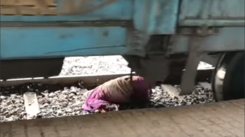 El clip evidencia cómo los testigos del hecho gritan horrorizados mientras la mujer permanece agachada esperando que el tren pase por encima de ella.