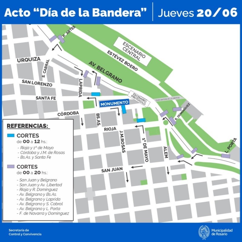 Con motivo del tradicional acto conmemorativo y los festejos populares por el Día de la Bandera, que contarán con la participación de autoridades nacionales, provinciales y municipales, instituciones y público masivo, la Municipalidad de Rosario, a través de la Secretaría de Control y Convivencia realiza desde el primer minuto de este jueves y hasta las 20 algunos cortes de tránsito.