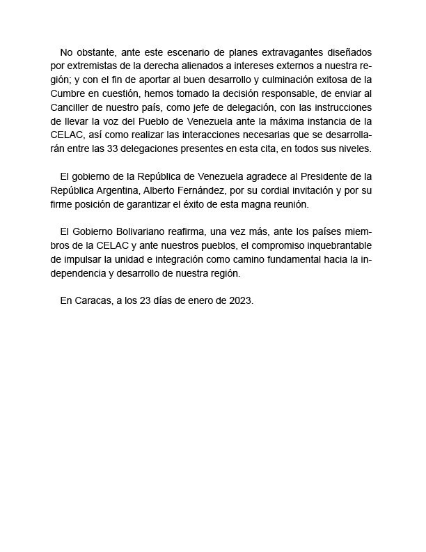 Agrega que el gobierno venezolano agradece al presidente argentino, Alberto Fernández, por "su cordial invitación y por su firme decisión de garantizar el éxito de esta magna reunión".