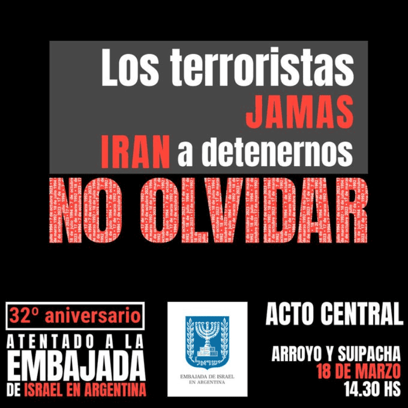 A 32 años del atentado a la Embajada de Israel, recordamos a sus víctimas y acompañamos a sus familiares.