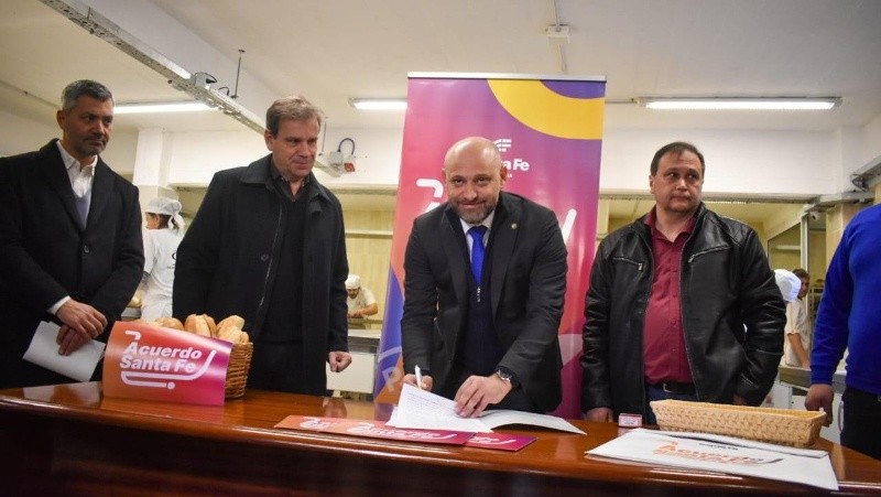 El ministro de Desarrollo Productivo, Gustavo Puccini, y el secretario de Comercio Interior y Servicios, Gustavo Rezzoaglio presentaron este martes, en la Asociación de Industriales Panaderos y Afines, la ampliación de Acuerdo Santa Fe en panaderías de Rosario. Desde ahora, el kilo de pan común se conseguirá a un precio promocional de 1.800 pesos en locales de la ciudad adheridos al convenio.