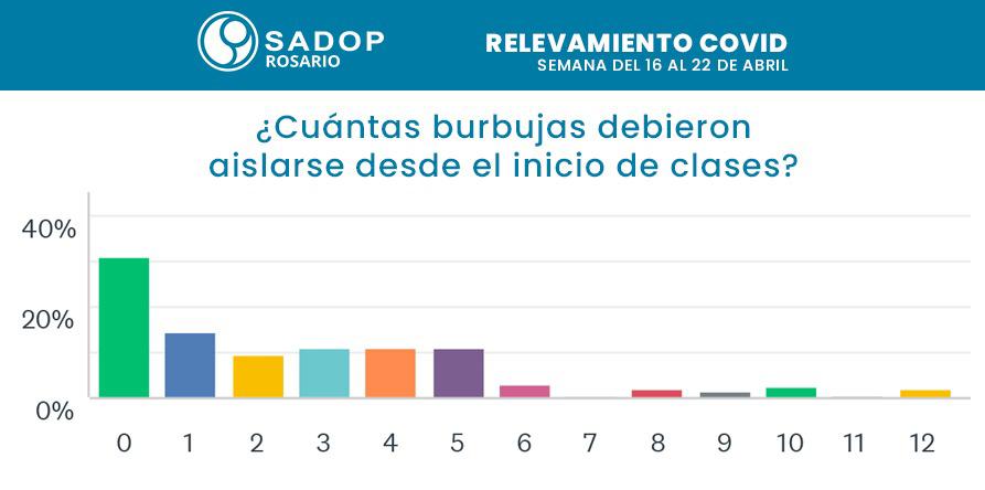 De igual manera, el informe detalló que 7 de cada 10 colegios manifiestan haber aislado burbujas. En muchos casos con entre 8 y 12 alumnos. Si este dato se cruza con la cantidad de casos positivos que los mismos establecimientos declaran, es evidente que la naturaleza preventiva del aislamiento de la burbuja se viene cumpliendo. Motivo por el cual no es un dato cuantitativamente llamativo.