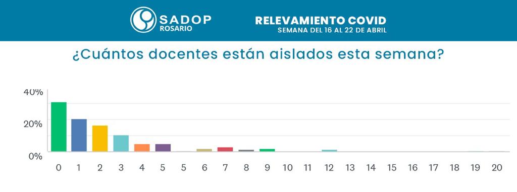 En el corte de última semana, puede observarse el aislamiento de docentes en 7 de cada 10 escuelas. Y aclara el dirigente que “si bien la proporción puede parecer alta, el dato desagregado indica que en la gran mayoría de los establecimientos la cantidad de docentes aislados muy poca: 1, 2 o 3. Por ende, en general, no hubo aislamientos masivos ni cierres de escuelas”.
