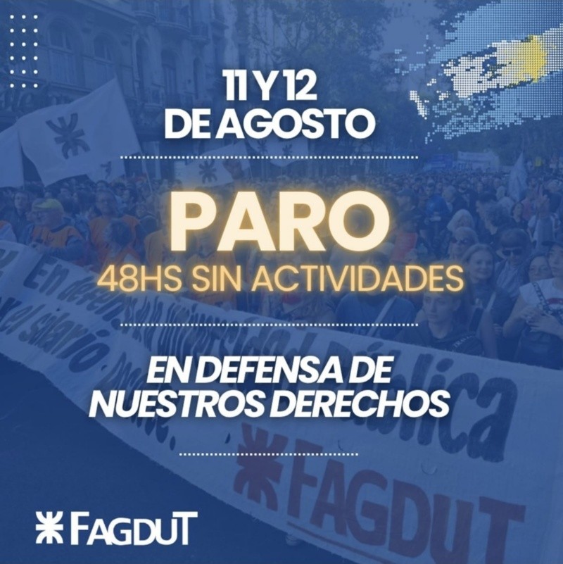 Por su parte, este lunes las facultades y escuelas de la UNR estarán cerradas por una huelga de los no docentes. Ante la falta de respuestas del gobierno nacional, la Federación Argentina de Trabajadores de las Universidades Nacionales (Fatun) resolvió convocar a un paro nacional sin asistencia a los lugares de trabajo para el lunes 11 de agosto.
