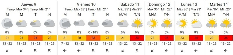 Pero para lunes y martes próximos, según el SMN, la mínima se anuncia en 23 grados y la máxima en sofocantes 36.