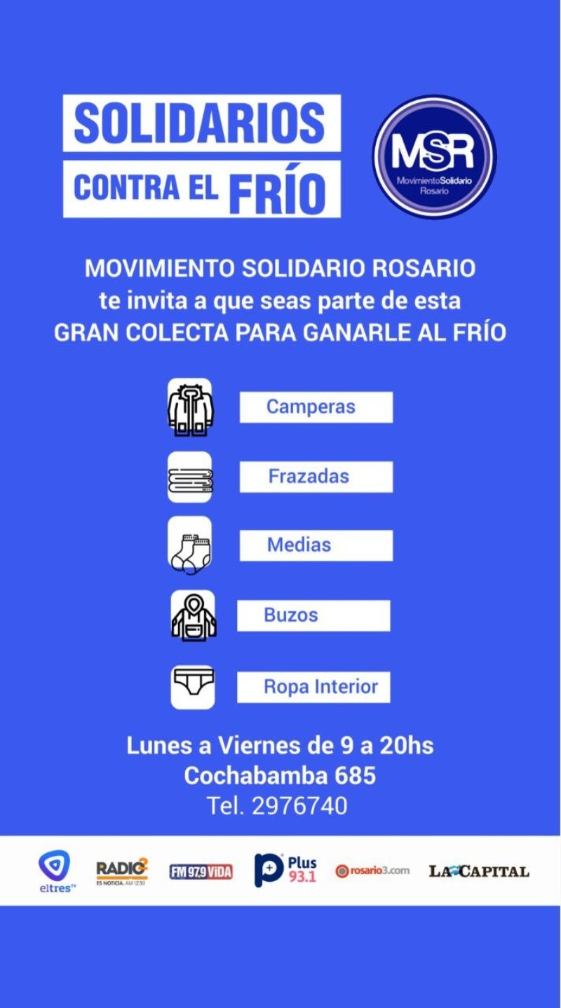 La ONG Movimiento Solidario Rosario y Grupo de Televisión Litoral llevan adelante la iniciativa "Solidarios contra el frío", una colecta para juntar abrigo y artículos para gente que se encuentra en situación de calle. De lunes a viernes, de 9 a 20, se reciben camperas, frazadas, medias, buzos, ropa interior y artículos de higiene personal en Cochabamba 685.