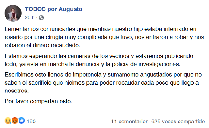 La familia había compartido un posteo en las redes sociales contando, con alegría, sobre la intervención quirúrgica que su hijo tuvo este lunes, agradeciendo a todos los que los apoyan de diferentes maneras. Pero al regresar a su casa el martes, se encontraron con que les habían robado el dinero que tenían guardado allí.