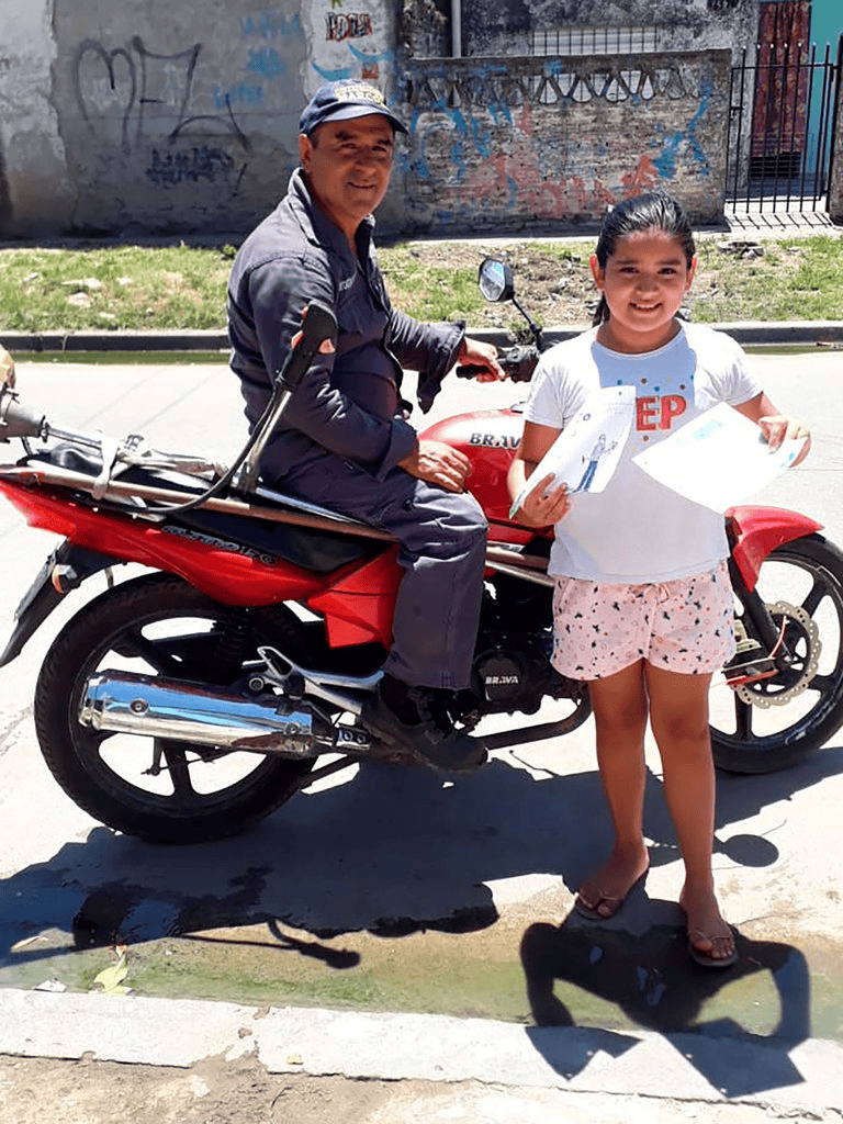 Todos los días, Gustavo sale a cortar pasto en su moto y su hija sale a la calle para despedirlo y desearle "suerte".