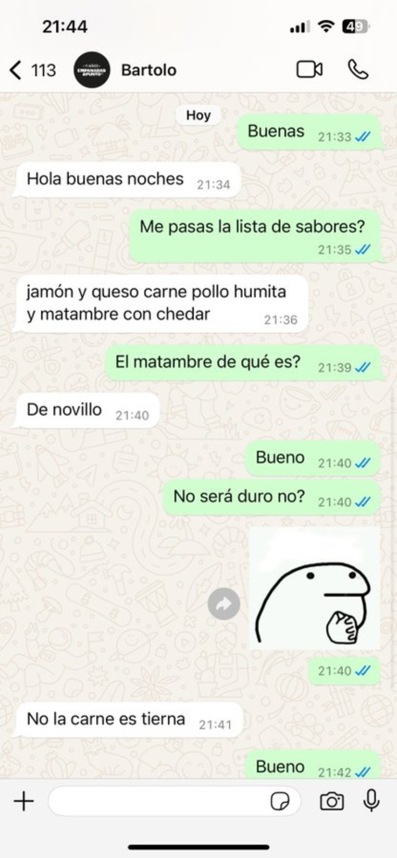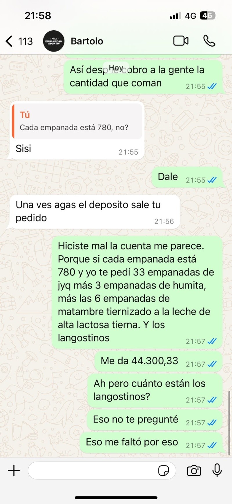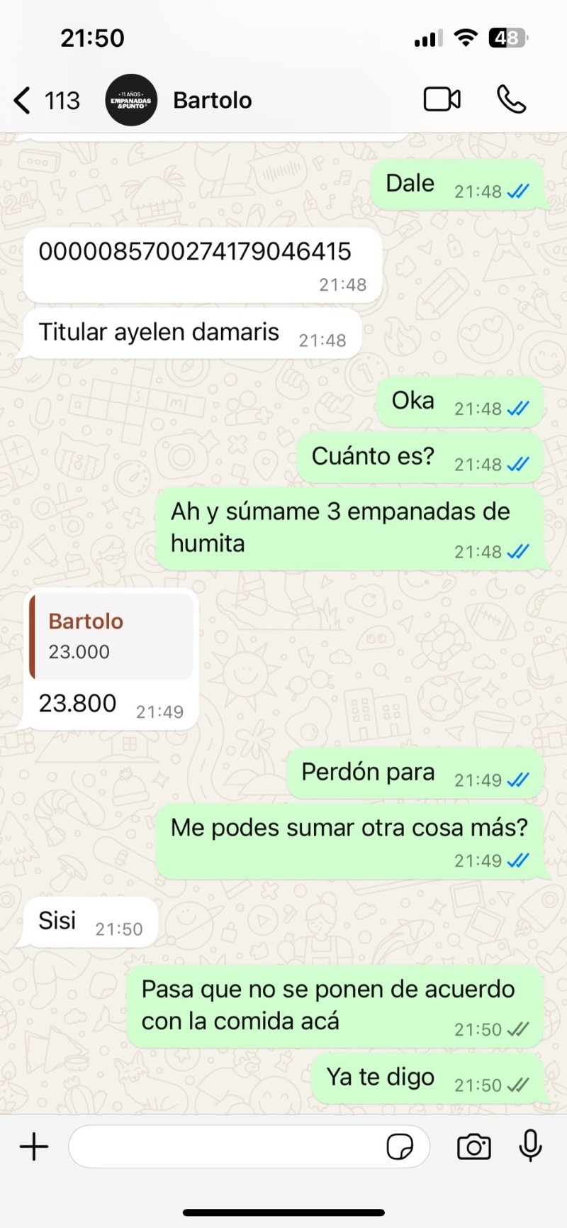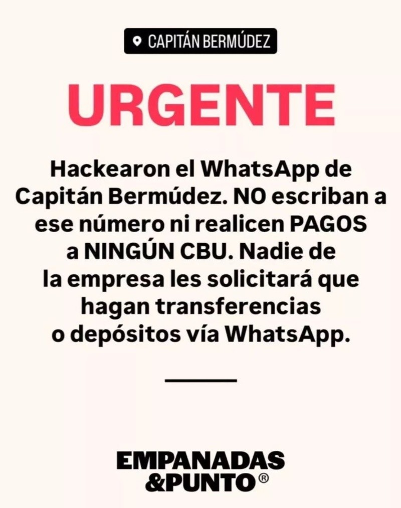 El joven le mandó un mensaje a la rotisería para pedir algo para comer. Hasta ahí solo le había pedido que le pase la lista de sabores de empanadas. Cuando entró al Instagram del local vio el anuncio del hackeo y el aviso a los clientes para que no manden transferencias.