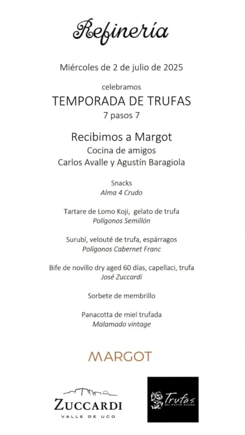 Como se adelantó, el próximo 2 de julio dicho restorán celebra los dones de la trufa en un menú de siete pasos. “Serán dos cenas junto a Agustín Baragiola, el chef y dueño del restorán Margot (de Santa Fe capital), con quien haremos un menú conjunto”, adelantó el chef de Refinería, en maridaje con la bodega Zuccardi. Snacks + Alma 4 Crudo Tartare de lomo Koji, fermentado con una yema trufada y un helado de trufa + Polígonos Semillón Surubí, velouté de trufa y espárragos + Polígonos Cabernet Franc Bife de novillo Angus madurado en 60 días, pasta capellaci trufada + José Zuccardi Sorbete de membrillo Panacota de miel trufada con peras de postre + Malamado Vintage Reservas al +54 9 3416 95-1250