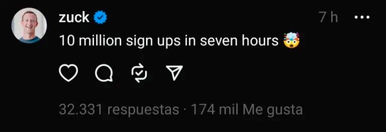 Quien se encargó de dar la noticia fue Mark Zuckerberg (CEO de Meta), que a las pocas horas del debut escribió a través de la Threads que la aplicación había logrado alcanzar los 10 millones de usuarios en sus primeras siete horas.