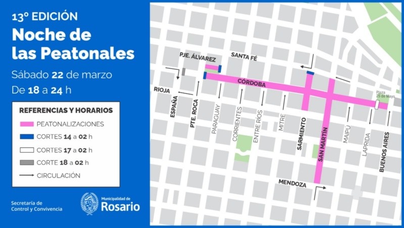 La actividad se desarrollaba en Córdoba desde España a Buenos Aires, San Martín desde San Lorenzo hasta Mendoza, y Sarmiento desde San Lorenzo hasta Rioja. Desde temprano, las principales calles del centro estaban peatonalizadas para que rosarinos y visitantes pudieran recorrer galerías comerciales, ferias y espacios culturales.