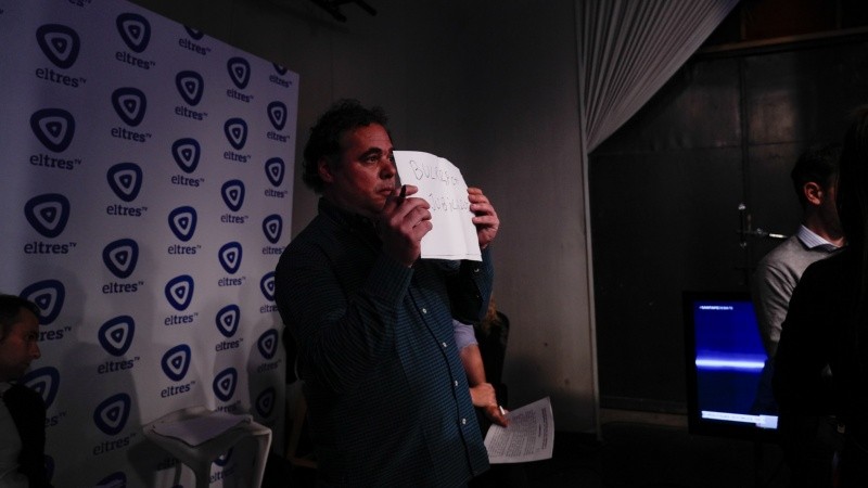 Los pasillos del canal estaban repletos. A los técnicos, productores y periodistas de la casa (El Tres, Radio 2 y Rosario3), se le sumaron los equipos de Telefé Rosario y Santa Fe, La Capital, Cronista, Revista Rea, Señal Santa Fe, Uno Santa Fe, Letra P y Aires de Santa Fe, quienes iban y venían organizando las coberturas. Mientras tanto, pasados algunos minutos de las 19, los candidatos y sus asesores se acomodaron en el estudio de TV, ajustando detalles. Parecían estudiantes a punto de rendir un examen, inseparables de sus apuntes, acomodando papeles en sus atriles. Los cuerpos despedían nerviosismo, los cuatro daban respiraciones largas y tomaban agua a la vista de sus acompañantes que tomaron asiento en unos taburetes altos, atrás de las cámaras.