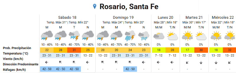 Para este sábado, el pronóstico en Rosario indica "tormentas aisladas" desde la madrugada, una mínima de 22 grados y una máxima de 31.