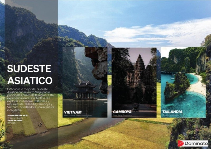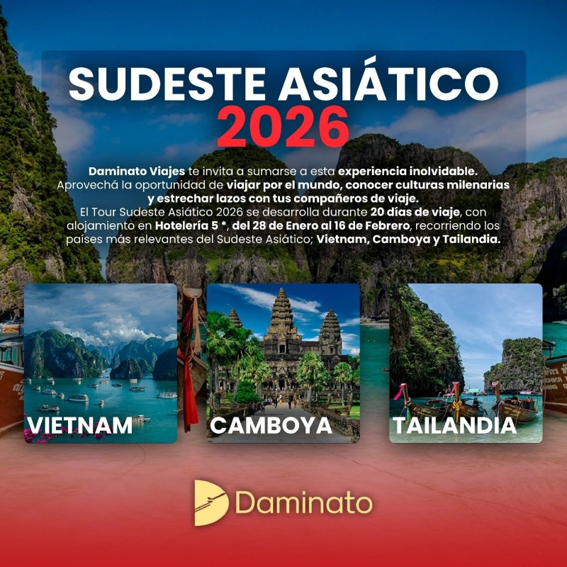 El Tour Sudeste Asiático 2026 se desarrolla durante 20 días de viaje, con alojamiento en hotelería 5 estrellas¸ del 28 de enero al 16 de febrero, recorriendo los países más relevantes: Vietnam, Cambodia y Tailandia.