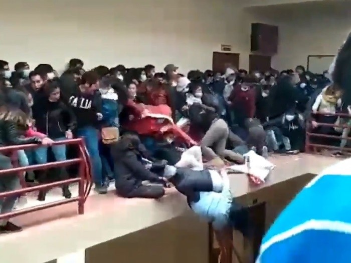 En varios videos que circulan por las redes sociales se ve a los estudiantes amontonados protestando en los corredores que dan a un salón, donde se realizaba la asamblea, momentos antes de que una de las barandas cediera y los ocho jóvenes cayeran desde el cuarto piso.