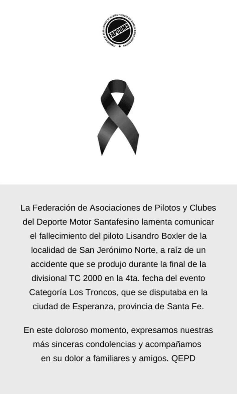 Un piloto de 37 años de la localidad de San Jerónimo Norte murió este domingo por la tarde en la competencia de la categoría Los Troncos en el circuito Los Toboganes de la ciudad santafesina de Esperanza. El accidente fatal se cobró la vida de Lisandro Boxler quien competía con un Ford Escort en la categoría TC 2000.