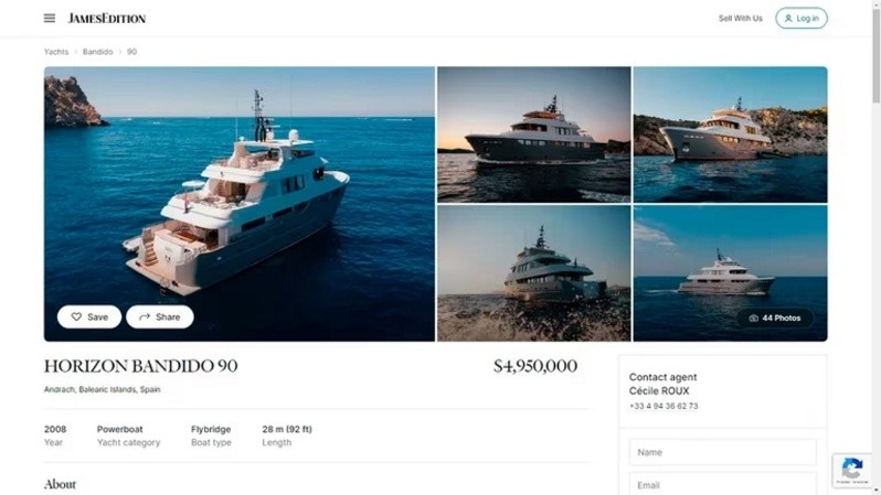 Según se detalla en la página donde está publicado el yate, el sitio web James Edition, "Bandido 90 está en perfecto estado, perfectamente adecuado para estancias prolongadas a bordo y cruceros de larga distancia".