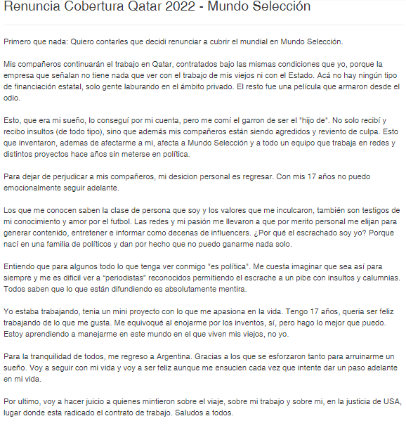 "Mis compañeros continuarán el trabajo en Qatar, contratados bajo las mismas condiciones que yo, porque la empresa que señalan no tiene nada que ver con el trabajo de mis viejos ni con el Estado. Acá no hay ningún tipo de financiación estatal, solo gente laburando en el ámbito privado", argumentó.