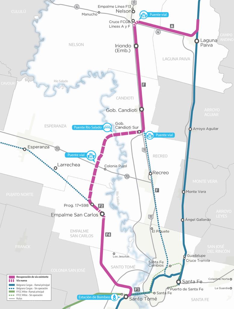 La obra en cuestión, será la primera circunvalación ferroviaria en el país para el transporte de mercancías y recorrerá desde el norte de Santo Tomé, en pleno ramal F, hasta la Laguna Paiva, región del ramal C. En definitiva, se trata de una inversión de $5.170 millones que quedó a cargo de las firmas Vial Agro S.A, a cargo del Renglón I; la unidad temporal Lemiro Pietroboni S.A – Merco Vial S.A – Sabavisa S.A, con el Renglón II; y la alianza Ferromel S.A – Herso S.A con el Renglón III.