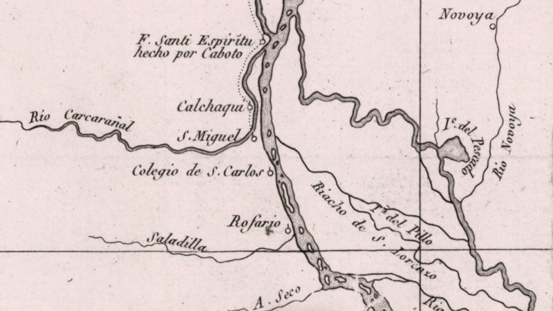 Mapa publicado por Félix de Azara en 1809. El "Fuerte Santi Espíritu hecho por Gaboto" y el "Río Carcarañal", al norte de Rosario.