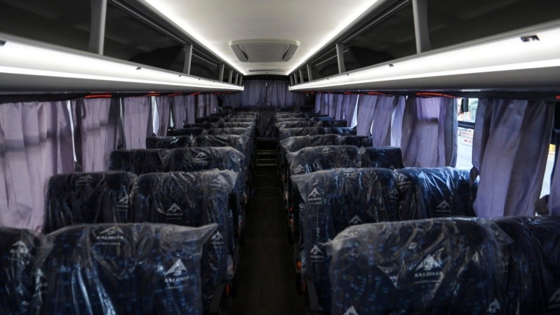 “El colectivo es un lujo”, dijo la chofer en la última parada de la semana y tiene razón. Con capacidad para 46 pasajeros, un pasillo amplió, asientos de tapizado negros con detalles azules que se reclinan y que aún están envueltos en el nylon de fábrica, puertos USB para cargar celulares, luces led en blanco y rojo y cortinas color gris.