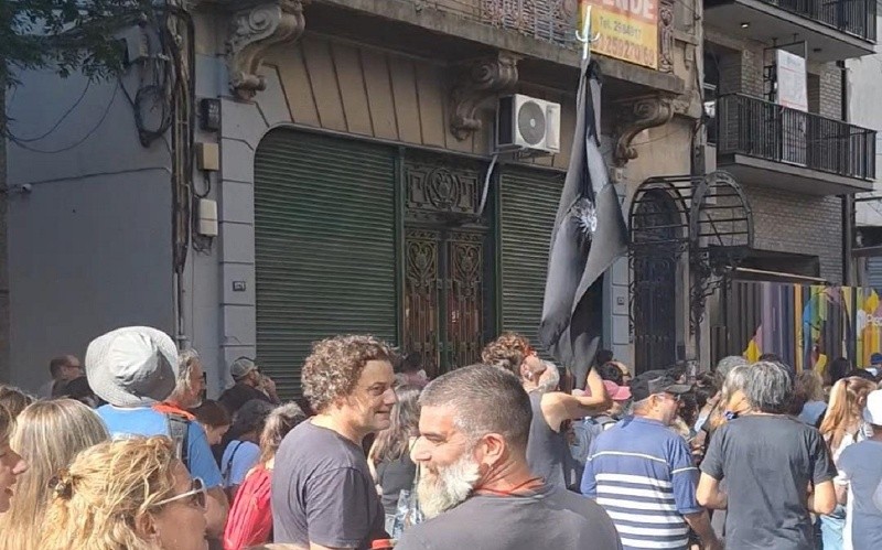 Disruptiva entre las columnas de jóvenes, flameaba una bandera completamente negra que emulaba la de Argentina con los pliegos y el sol en el medio. “Es parte de mi muestra de arte ‘La memoria también es la sombra de los párpados'”, explicó Joaquines, su autor, artista plástico que la llevaba en alto; y agregó que en su muestra, en la galería Gabelich, también hay “un Ford Falcon fantasmal”.