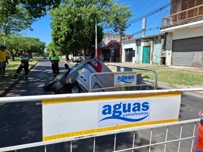 Un automovilista terminó con su auto incrustado dentro de un enorme pozo de Aguas Santafesinas que no estaba bien señalizado. Ocurrió este sábado por la mañana en Francia al 2900, a la altura de calle Rueda. El conductor logró salir por sus propios medios y ahora aguarda la llegada de una grúa especial que le permita retirar el vehículo.