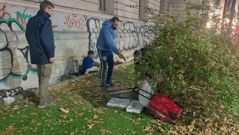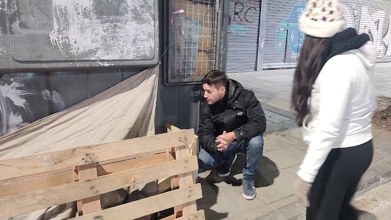 Aunque tiene sus propios planes, acompaña a los voluntarios hasta el borde de la vereda. Detrás de un kiosco de revistas, una especie de carpa fue improvisada por Mario, quien desde su interior, se niega a subir al micro sin que se le vea la cara. Flavio y Paula intentan convencerlo, "¿por qué no te venís con nosotros, que podés dormir calentito y a la mañana te damos el desayuno?". No hay nada que hacer más que seguir.