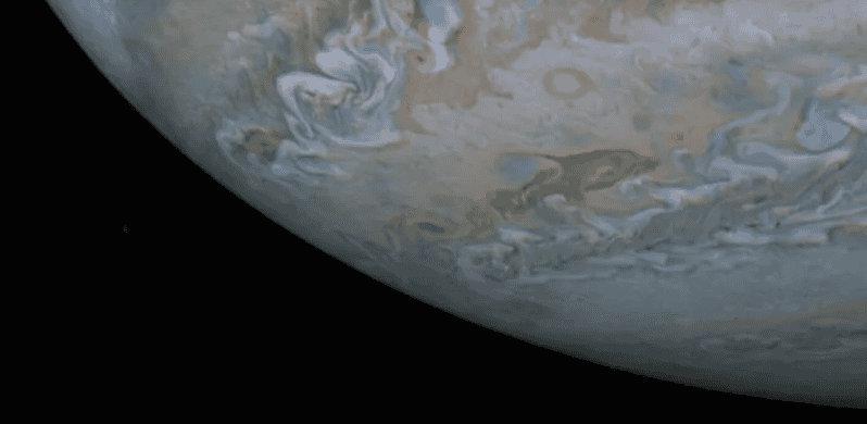 Al analizar los datos y componer la imagen, los científicos se toparon con esta curiosa figura. La silueta con forma de delfín parece deslizarse entre las coloridas formaciones de nubes a lo largo del Cinturón Templado Sur de Júpiter, captada a unos 32 a 59 grados de latitud sur.