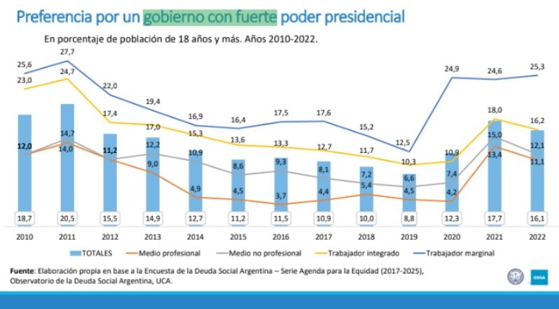 Entre los años 2018 y 2019 se registraron los mayores niveles de rechazo en el sistema democrático (70 y 60%) mientras que en 2020 y 2021 había disminuido (30 y 40%) pero el año pasado volvió a crecer la disconformidad con la democracia al orden del 55%.