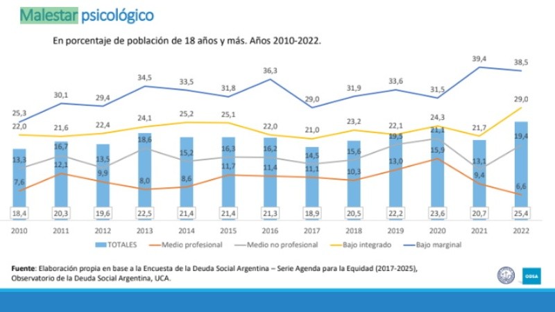 Un informe realizado por el Observatorio de la Deuda Social de la Universidad Católica Argentina (UCA) que se titula "Desigualdades y retrocesos en el desarrollo humano y social 2010-2022", midió y analizó la salud mental y emocional de los argentinos y según precisaron, el malestar psicológico en la población aumentó. Asimismo, indicaron que es alarmante el descontento social con la democracia, los partidos políticos y el sistema presidencial.