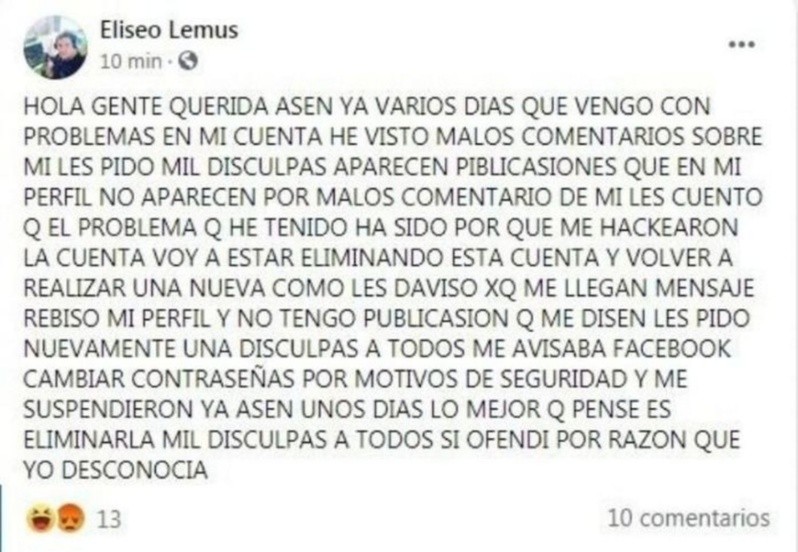 “Hola, gente querida. Hace ya varios días que vengo con problemas en mi cuenta. Les pido mil disculpas, les cuento que me hackearon y que voy a crear una nueva”, remarcó Lemus en un escrito que ya no aparece en su cuenta, pero que muchos hicieron captura.