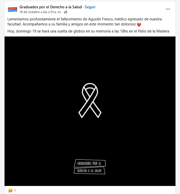Barrio Lourdes sigue conmocionado por la muerte de Agustín Fresco, un joven médico entrerriano que se asentó en Rosario primero para estudiar y después para trabajar. La semana pasada sufrió un accidente mientras realizaba trekking en el Parque Nacional Los Glaciares y falleció. El domingo pasado realizaron una suelta de globos en su memoria en el Patio de la Madera.