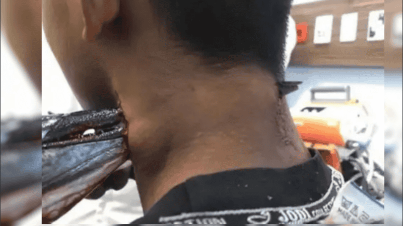 Finalmente, cinco médicos especialistas lograron extraer la cabeza del pez tras una operación que duró una hora. Ahora que han pasado unos días, el joven está fuera de peligro y lleva una venda en el cuello.