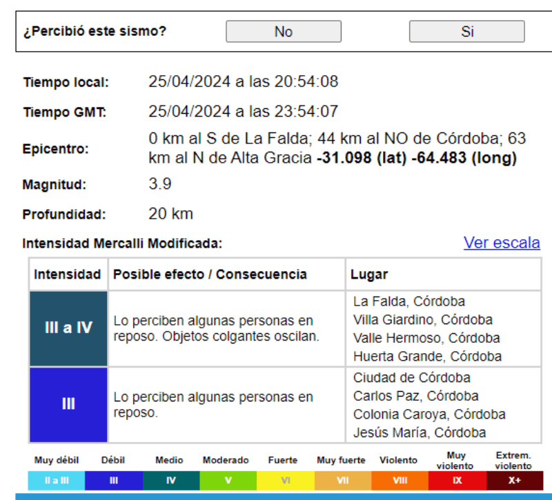 El sismo tuvo una breve duración, pero los lugares donde más se sintió fueron Villa Giardino, Bialet Massé, Alta Gracia, La Calera y Tanti, entre otras localidades, según reportaron los usuarios en redes sociales.