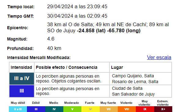 De acuerdo también con los datos proporcionados por el Inpres, en la zona de Campo Quijano-Rosario de Lerma, la intensidad del sismo osciló entre tres y cuatro en la escala correspondiente y este rango implica la percepción del movimiento por parte de algunas personas en reposo, así como el oscilar de objetos colgantes.