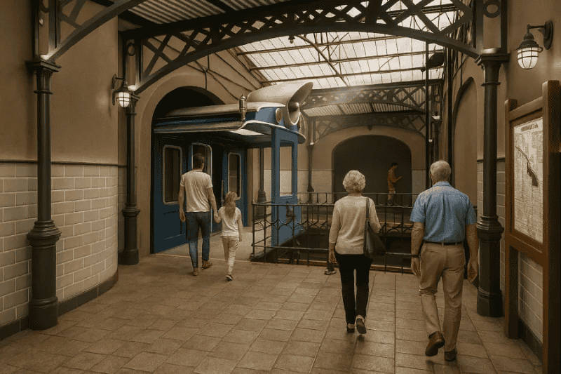 La travesía comienza en la Estación Rosario 300, una continuación simbólica de las antiguas estaciones ferroviarias. En la sala de ingreso, las escenografías y los sonidos de época anticipan lo que vendrá. Desde allí, los visitantes acceden a un simulador de gran formato con tecnología E-Motion, que los transporta por los hitos históricos de la ciudad: los muelles, las vías del tren y los paisajes urbanos que marcaron su evolución.