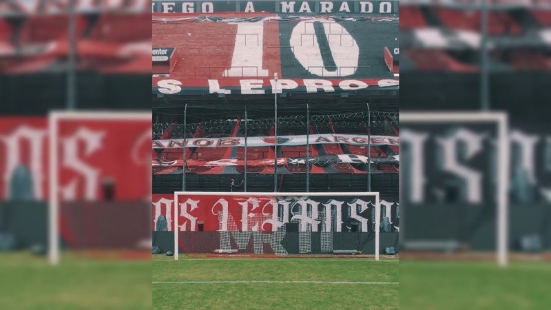 En el segundo nueve del video, un plano desde el campo de juego apunta hacia la tribuna Diego Maradona, que luce vacía pero con todo los trapos preparados para el evento. Entre tirantes rojinegros, en la bandeja superior se observa la bandera de Los Monos, envuelta sobre sí misma.